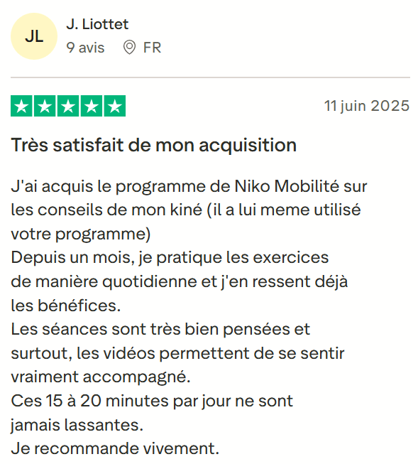 En 3 semaines j'ai déjà retrouvé de la mobilité au niveau de mes hanches et moins de douleurs au dos, poignets, épaules. Je suis vraiment ravie d'être tombée sur ton programme niko. Merci à toi 🙏"