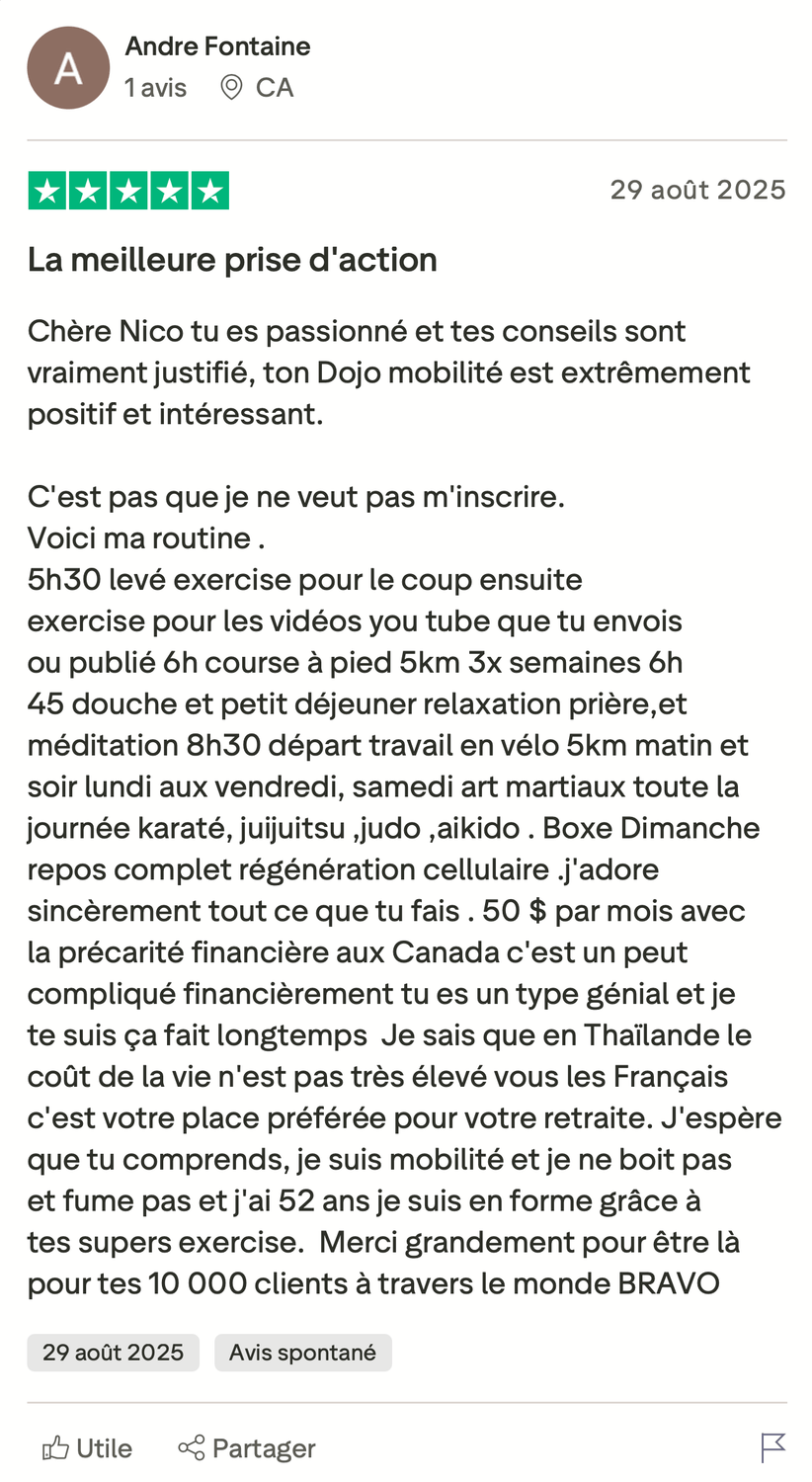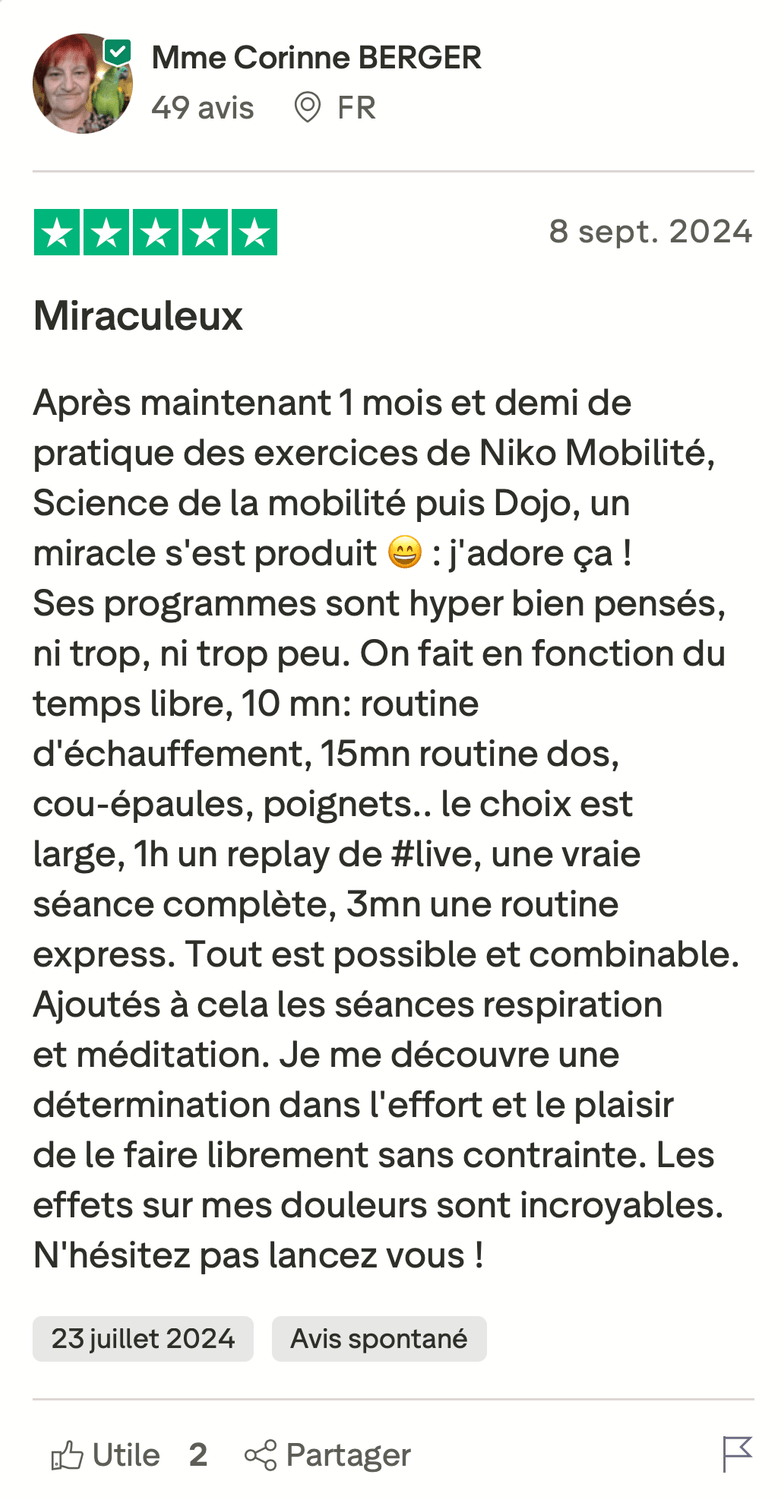 Découvrez comment plus de 15 361 personnes de 40 à 80 ans ont réussi à retrouver le plaisir de vivre dans un corps souple et sans douleur naturellement en seulement 15 minutes par jour grâce au Dojo.